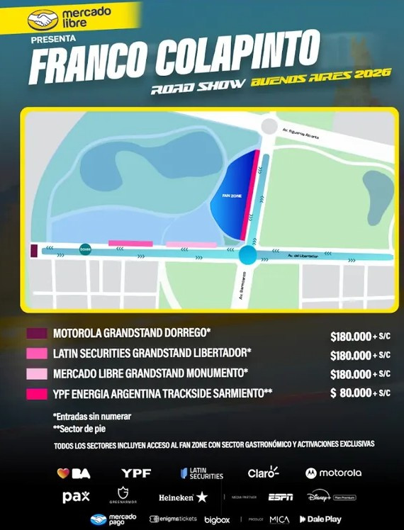 Bajo el nombre “Mercado Libre presenta: Franco Colapinto Road Show Buenos Aires 2026”, la capital argentina será sede de un espectáculo sin precedentes, donde el piloto argentino girará con un auto de Fórmula 1 en un circuito urbano especialmente montado para la ocasión.