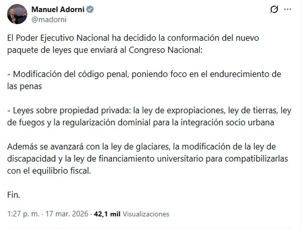 A través de un mensaje publicado por el jefe de Gabinete Manuel Adorni, el Poder Ejecutivo confirmó que enviará al Congreso un nuevo paquete legislativo que incluye reformas penales, cambios en normativas sobre propiedad privada y ajustes en leyes con impacto fiscal