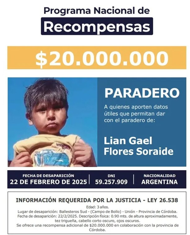A un año de la desaparición de Lian Flores, el niño de tres años visto por última vez el 22 de febrero de 2025 en Ballesteros Sud (Córdoba), la familia aseguró que surgió una nueva pista que apunta a que el menor podría haber sido visto en Bolivia.