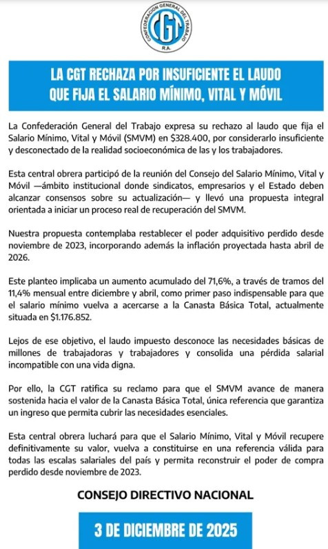 La central obrera cuestionó el laudo que fijó el SMVM en $328.400 y reclamó que se acerque a la Canasta Básica Total, hoy en $1.176.852. Anticipó que seguirá impulsando acciones para recuperar el poder adquisitivo.