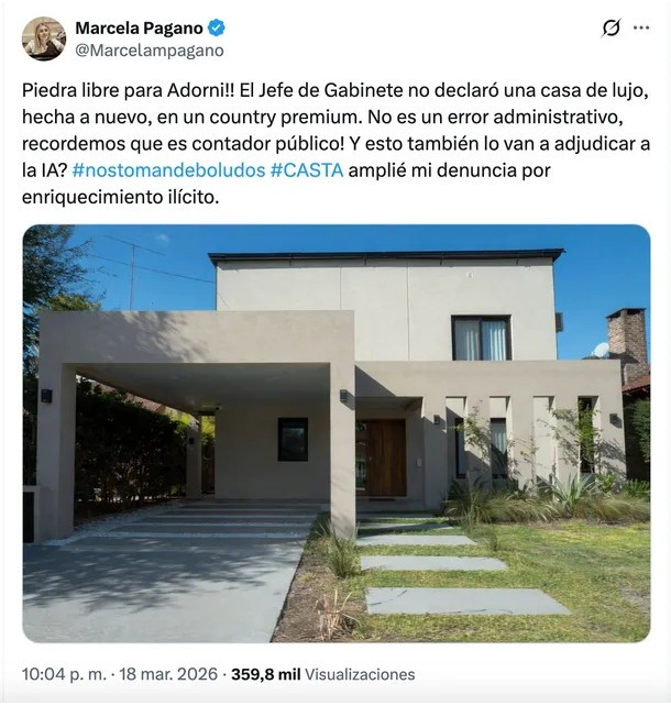 La diputada nacional Marcela Pagano amplió su denuncia por enriquecimiento ilícito contra Adorni, acusándolo de no declarar una vivienda de lujo en un country premium de Exaltación de la Cruz.