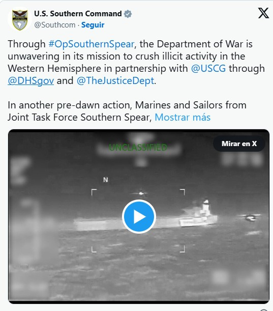 “El único petróleo que saldrá de Venezuela será el que se coordine de forma adecuada y legal”, señaló el Comando Sur, en el marco de la campaña marítima destinada a hacer cumplir las sanciones impuestas a embarcaciones asociadas al comercio petrolero venezolano.